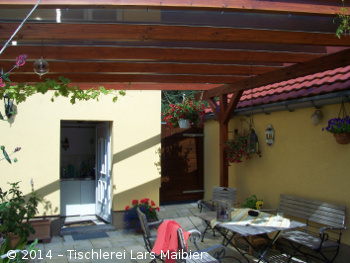 In Konstruktionsvollholz Douglasie Balkenverbindungen gezapft mit Hohlkammerplatten gedeckt